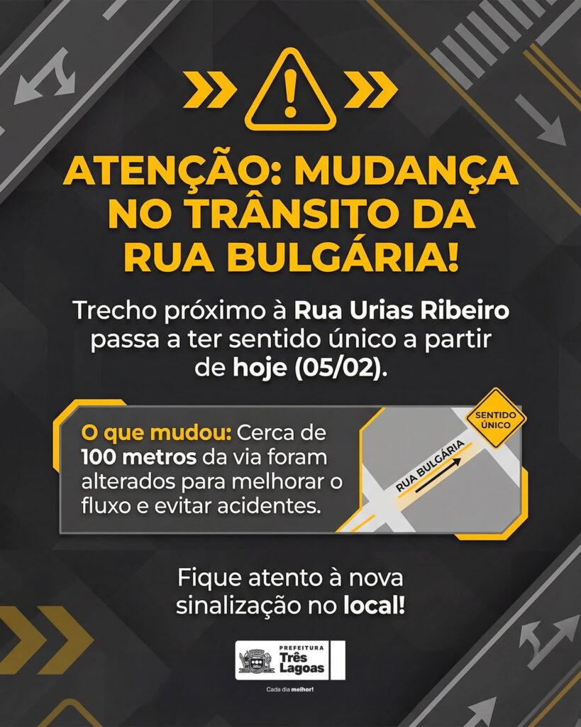 A Prefeitura de Três Lagoas informa que um trecho estratégico da Rua Bulgária (próximo à Rua Urias Ribeiro) passa a ser de sentido único a partir desta quinta-feira, 05 de fevereiro.